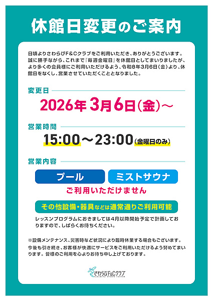 誠に勝手ながら、これまで『毎週金曜日』を休館日としてまいりましたが、より多くの会員様にご利用いただけるよう、令和8年3月6日(金)より、休館日をなくし、営業させていただくこととなりました。
